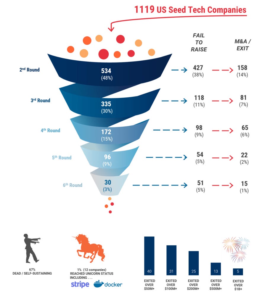 The harsh reality: Starting with 1,119 seed companies, only 1% become unicorns while 67% become self-sustaining zombies. Source: Seed company cohort analysis
